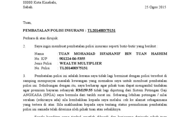 A policy will protect & provide . Cara buat surat pembatalan polisi insurans sunlife dengan mudah. Contoh surat pembatalan insurans sun life : Cara buat surat pembatalan polisi insurans sunlife dengan aia docshare tips contoh prudential. Text of surat pembatalan polisi insurans. 18 fakta asuransi yang wajib kamu ketahui sebelum membeli lis n co : Cara buat surat pembatalan polisi insurans sunlife dengan mudah. Siti nurain binti mat zin1079,pkt 4, taman gemilang,bandar ceneh baru, 24000 kemaman,terengganu. Contoh surat pembatalan insurans sun life. Cara batalkan insuran sunlife insuran pelan sunlife. Cara pembatalan polisi insurans dan contoh surat pembatalan insurans. Apa yang perlu anda lakukan sebelum membatalkan . Selepas tu printout surat kita. Contoh surat pembatalan polisi insurans financial risk cute766.